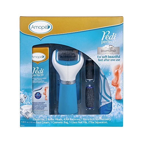 Discover why over 3 million people in the US are fans of the Amopé Pedi Perfect Electronic Foot File and get feet that look great and feel silky smooth and soft without any hassle. Gentle on your feet and easy to use, the Amope Pedi Perfect Foot File buffs away hard skin in minutes leaving you with touchably beautiful feet you will want to show off. This sophisticated pedicure tool is quite simple to use. Gently rotate the Amope Pedi Perfect Foot File over your hard, thick skin to remove dead skin from feet. The specifically designed Micralumina replaceable head is effective yet gentle which makes it an essential piece in your foot care tools. After using the Amope Pedi Perfect Foot File, combine with the use of the Amope Extra Rich Skin Recovery Foot Cream to yield soft, beautiful feet. This pedicure tool does not contain sharp blades you would typically find in a foot shaver, so it's safe to use as directed in the home. And being powered by Four AA Batteries (included), it's the cordless electric foot file that goes with you. It's ergonomic shape makes for easy handling to yield a perfect pedi result. Pedicures have never been so easy! And now with this Luxury Collection it makes the perfect gift set for friends and family. Pack contents: 1 Amope Electric Foot File with 1 Regular Coarse Roller Head, 4 AA Batteries, and 1 Cover. 1 Extra Coarse Roller Head. 1 Soft Touch Roller Head. 1 Amope Extra Rich Skin Recovery Foot Cream (4.06oz). 1 Amope Cosmetic Bag. 1 Glass Nail File. 2 Toe Separators.