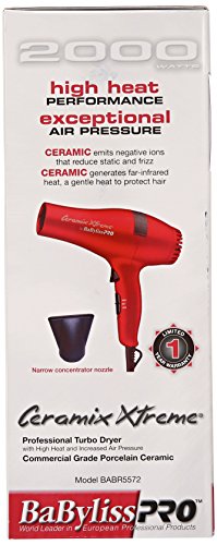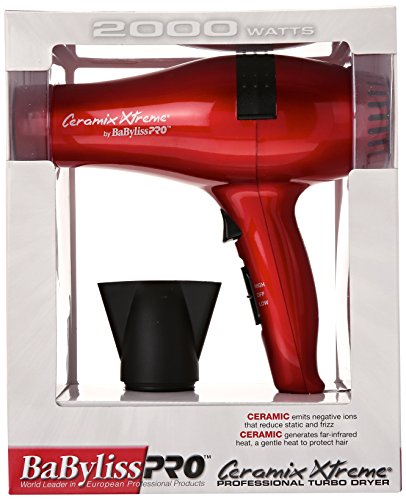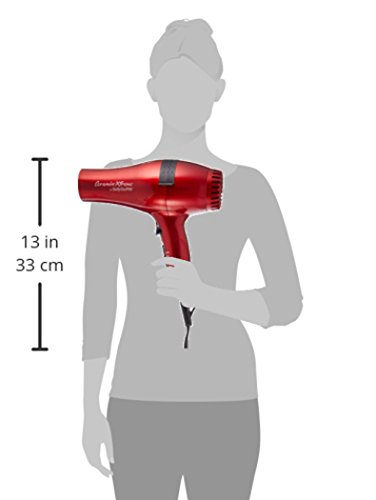 This red 2000-watt dryer features ceramic technology to produce extra-gentle, far-infrared heat that protects hair from damage. It has 2 temperature settings along with a cool shot button and a concentrator nozzle.
