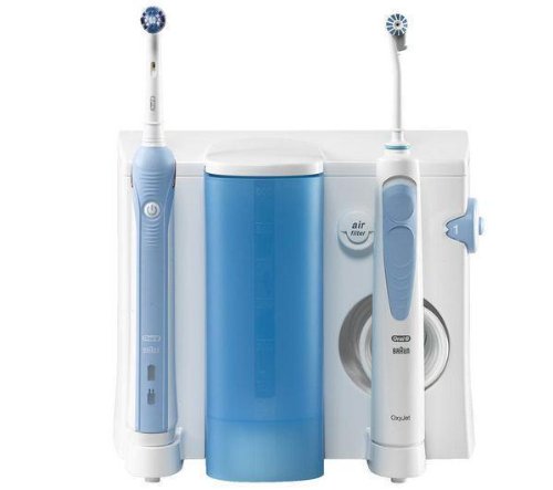 El combinadodental Profesional Care Oxyjet + 1000 de Oral-B es unkit completo que ofrece un cepillo de dientes eléctrico y un hidropropulsor. El cepillo de dientes eléctrico recargable Profesional Care Oxyjet + 1000 incluye los cepillos Precision Clean y Flossaction parala limpieza eficaz y completa de la placa dental. Es seguro, integra un sensorde presión que detiene las pulsaciones si el cepillado es demasiado intenso. El hidroproplusor ha sido diseñado para refrescar y limpiar los dientes yencías. Puede utilizarse en mono chorro para limpiar con precisión o en chorrogiratorio para un delicado masaje de las encías. El combinado dental Oral-B Profesional Care Oxyjet + 1000 teaportará una higiene impecable a diario.