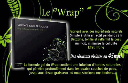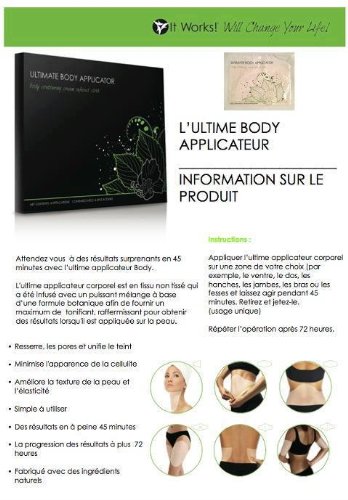 Le wrap It Works est un applicateur corporel élaboré par des chercheurs botanistes en exclusivité par It Works , son application est simple , facile et rapide , les effets sont visibles dès 45 minutes de pose du wrap et après son retrait son action se prolonge pendant 3 jours encore les composants du patch continuent d'agir sur votre corps .