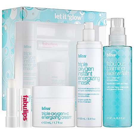 Let it' glow' Vacation assortment Four piece reward set (four most famous formulation for your face). Contains: triple oxygen immediate energizing masks (3.4 ounce) and triple oxygen TM plus Energizing cream (1.7 ounce) and fabulips softening lip balm and and incredible foaming face wash (6.7 ounce).