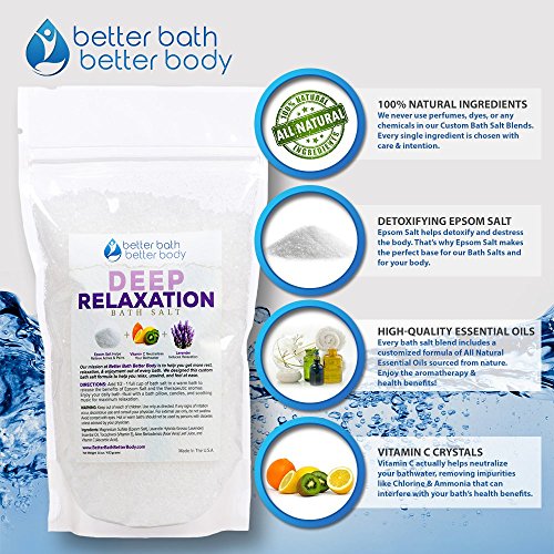*NO CHEMICALS, NO PERFUMES, & NO DYES* This Deep Relaxation Bath Salt formula is 100% natural and includes zero chemicals, perfumes, or dyes. The next time you purchase Bathing Salts for your tub or spa, be sure to double-check the ingredients. Unfortunately, many bath salts often include added chemicals, fragrances, perfumes, and dyes. These unnecessary ingredients are bad for your body and your bath-tub.