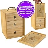 - EXCELLENT CRAFTMANSHIP WITH ELEGANT DESIGN: Made from high quality pine wood with a beautiful etched design on the removable front panel designed to secure the three drawers. Dovetail edging gives this box an elegant look while making sure it holds together strong. Perfect for displaying your fine collection of oils.