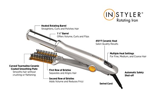 The InStyler Original Rotating Hot Iron is a styling and straightening tool unlike any other. With the InStyler's patented design, your hair won't get flattened and baked like the extremely intense heat of a flat iron or other 'hot' tool. The InStyler uses less heat than traditional hot tools, and delivers better results. The secret lies in its rotating heated polishing cylinder, tourmaline ceramic floating plate and four rows of precision-aligned bristles. The original 1 1/4 inches barrel size creates incredible volume and loose curls and waves. The smaller 3/4 inches barrel size is great for shorter hair, creating tight curls and bangs, as well as styling closer to the root.