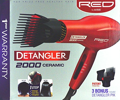Red by kiss detangler dryer plus 3 attachments: detangle, straighten and style all in one simple step, lightweight dc motor, ceramic ionic technology-safely dries hair; protecting hair from heat damage, promoting healthy, shiny hair, patented double layer pik, 2 bonus attachments plus detangling pik, 2 heat/2 speed rocker switch settings, removable filter. Hanging loop, 1 year warranty.