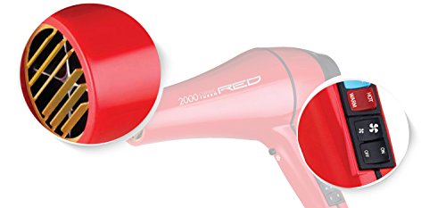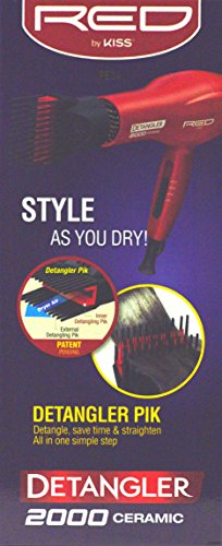 Red by kiss detangler dryer plus 3 attachments: detangle, straighten and style all in one simple step, lightweight dc motor, ceramic ionic technology-safely dries hair; protecting hair from heat damage, promoting healthy, shiny hair, patented double layer pik, 2 bonus attachments plus detangling pik, 2 heat/2 speed rocker switch settings, removable filter. Hanging loop, 1 year warranty.