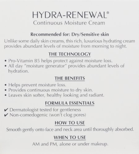 Wealthy, steeply-priced cream is perfect for girls with dry, sensitive pores and skin. With Professional-Nutrition B5, moisture is repeatedly launched to hydrate pores and skin all day long. With Hydra-Renewal Continuous Moisture Cream, skin is softer, healthy looking, and radiant.