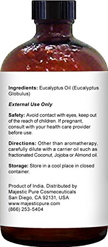 Eucalyptus Oil has well known benefits for aromatherapy, skin care and health. It is a must have oil for your home. Eucalyptus essential oil is extracted from the dried leaves of the eucalyptus tree through steam distillation. It is considered to be one of the most popular aromatherapy oils. It is largely used for first aid purposes because of its vast remedial properties. It is known to help with cuts, minor wounds, blisters, and bruises. The list of eucalyptus oil uses and health benefits just goes on and on. Eucalyptus oil can be used in relaxing or therapeutic massages. It has many antifungal properties that can help reduce infection, restrain residue build up and clogging of pores. Eucalyptus oil can improve improves shine, thickness, and overall health of hair. Eucalyptus essential oil has many bug repellent qualities. It is a natural pesticide used for head lice. Majestic Pure Eucalyptus Oil is Steam Distilled Highest Quality Oil Extracted from the leaves of the eucalyptus tree. Superior sourced and hand picked are used. Our oils are by far the most effective on the market. Click the Button at the Top of this Page to Buy with Confidence