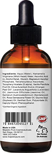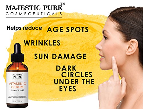 Look Younger Without Using Bunch Of Makeup? Experience The Anti Aging Power Of Majestic Pure Vitamin C serum. Leaves Your Skin Beautiful and Radiant. Vitamin C is critical for human body and plays an important role in maintaining resilient skin. Vitamin C skin serum is a high potency serum for use on facial areas. It fights premature aging and UV damage by replenishing vitamin C levels to on skin help to combat and even reverse time effect on face. With the antioxidant properties, Vitamin C face Serum is a key co-factor in the production of collagen which improves skin tone and texture. Stabilizing levels of vitamin C helps to counteract wrinkle formation. The Vitamin Serum fights free-radical damage and sun damage and improves pigmentation issues. It protects against UV damage like discoloration and fine lines. You will not find a better higher quality and Effective Vitamin C Serum on the market.