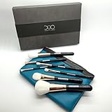 Rose golden and black brushes with white bristles in a luxury blue pouch. Vegan approved luxury set.