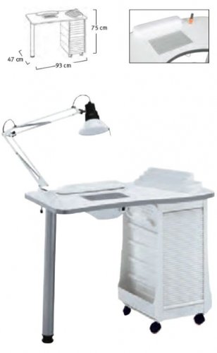 ACCESSOIRES SALONS D'ESTHETIQUE Table manucure aspi blanche avec aspirateur-coussin. Lampe de travail articulee non fournie a commander a part-Plateau bois agglomere Tiroirs et colonne,porte coulissante plastique, pied metallique Dim voir photo