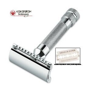 Double edge razor from German Merkur. Manufactured in steel with a hand-tooled high-polish chrome finish. Powerful and trustworthy design made for lifetime use. Also perfect when traveling.A double edge razorblade lasts up to three times as long as a regular razor cartridge with 3-blades.One Merkur Super Platinum razor blade is included. Perfect for Gents shaving brush & razor stand – crome.