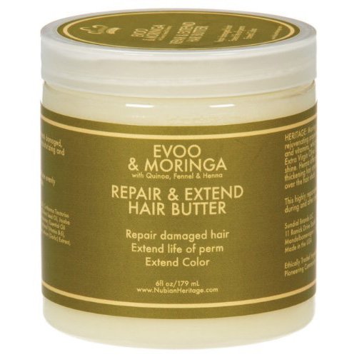 Nubian Heritage Evoo and moringa Repair and Lengthen hair butter treats broken dry and brittle hair with olive and moringa oils, whereas moisturizing and defending with quinoa and fennel.