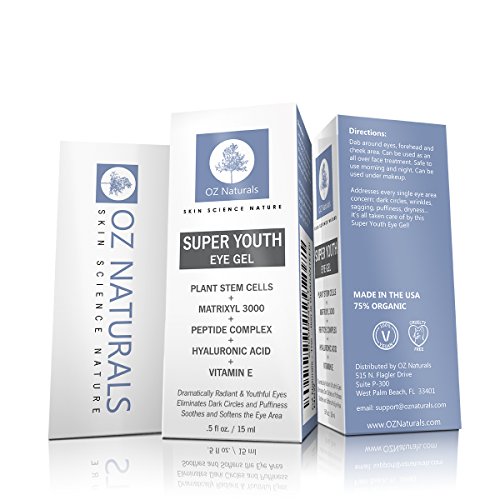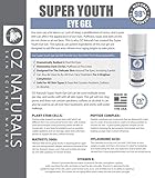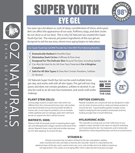 Experience the most effective eye treatment designed to eliminate dark circles, puffiness and wrinkles! This eye gel is considered to be the most effective and complete eye treatment available. Designed to treat every major concern including dark circles, puffiness and wrinkles. Safe for all skin types, non comedogenic, does not contain parabens, sulfates or alcohol. All active ingredients are 100% natural and 75% organic. Made in the USA in our advanced FDA certified facility. Behind the science: our eyes say a lot about us. Lack of sleep, a proliferation of stress, a poor diet can all affect the way our eyes look. Puffiness, bags, and dark circles do not show us at our best. Also, sun exposure and the inevitable aging process contribute to crows feet and even wrinkles on the upper lid. This is why Oz Naturals has created Super Youth Eye Gel. It's an all-natural product designed to give you real results. All Oz Naturals products are 100% vegan, cruelty-free, paraben-free, sulfate-free, mineral oil-free, lanolin-free, gluten-free, and GMO-free. Oz Naturals takes pride in making every single one of our products using natural and organic materials. We do not and will never use sulfates or parabens in our formulas.