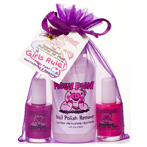 This non-toxic and hypoallergenic Piggy Paint Girls Rule Gift Set is safe to use on all piggies. Piggy Paint nail polish dries to a hard and durable finish which can be easily removed with the acetone free Piggy Paint Nail Polish remover. Piggy Paint formulas are natural and designed for fancy girls of all ages.