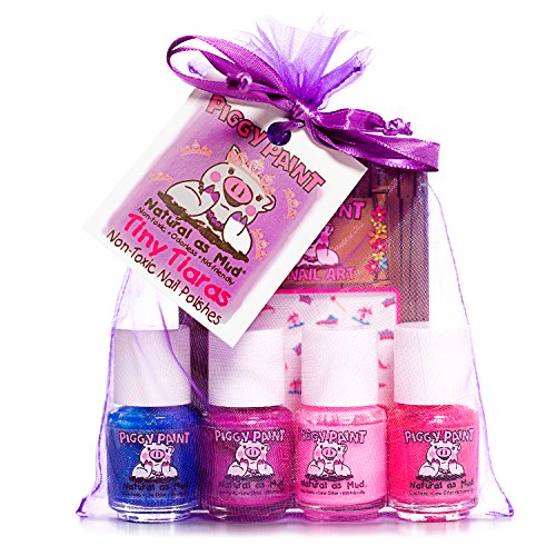 Piggy paint tiny tiaras gift set contains colors brand spank'n blue (royal blue glitter), girls rule (bright, shimmery purple), pinkie promise (neon, matte light pink), forever fancy (bright pink shimmer) + princess nail art in a purple organza bag(.25 fl. oz. bottles).
