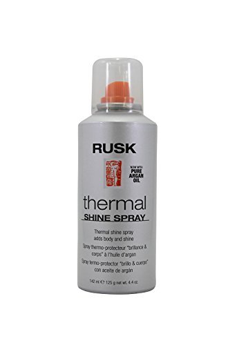 Rusk Thermal Shine Spray, Thermal Shine Spray adds Body and Shine. Now with Pure Argan Oil 4.4oz. Eliminates frizz, improves the condition of the cuticle and outer shaft, and protects the hair internally and externally. Imparts smoothing and shine-enhancing benefits.