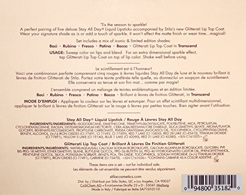 ‘tis the season to sparkle! Create your perfect pout with one of stila's deluxe stay all day liquid lipsticks. Wear any shade as is or add light and sparkle with our new glitterati lip top coat. Lips will hold a matte finish, but glow with ethereal elegance: endless options in one complete collection! Set includes a mix of iconic and limited edition shades.