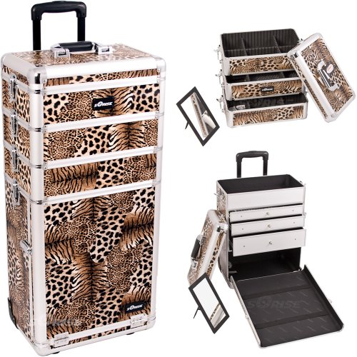 - A Trendy, Skilled, and highly-equipped rolling Makeup case with glamorous leopard-print aluminum End and silver aluminum trim.