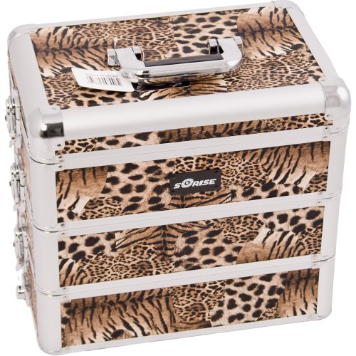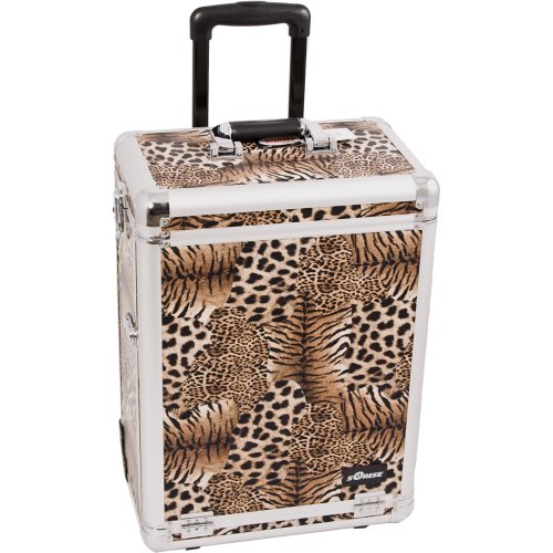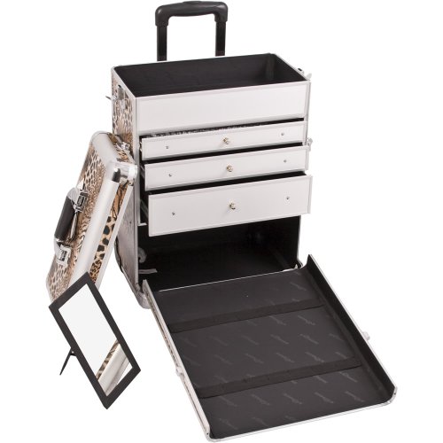 - A Trendy, Skilled, and highly-equipped rolling Makeup case with glamorous leopard-print aluminum End and silver aluminum trim.