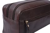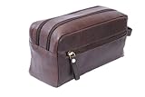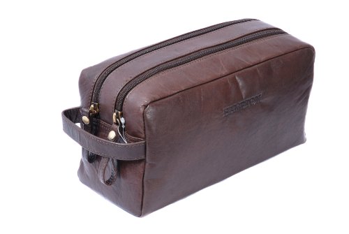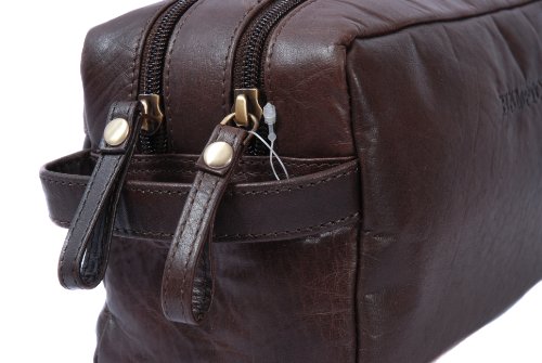 Super quality leather washbag in traditional styling. Made of dark brown buffalo hide the leather is soft with subtle tones. The washbag has a grab handle, 2 zip up compartments, plus one zip up pocket on the front. The Hansson logo is embossed on the front and the zips have leather tabs. Dimensions: 27 cm wide x 15 cm high x 13 cm deep.