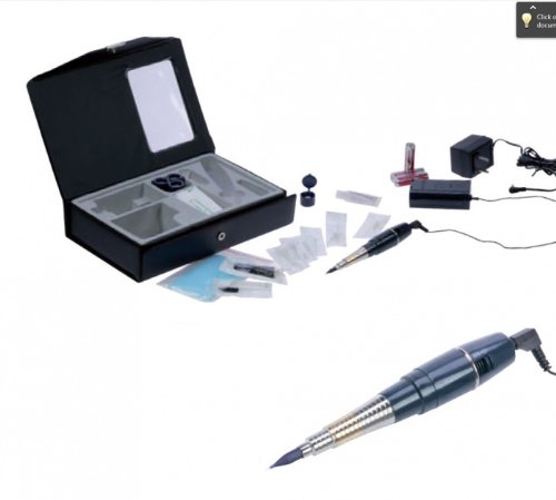 Materiel pour maquillage permanent. Dermograph petit modele complet, avec coffret de rangement moteur 2 vitesses, transformateur bloc avec batterie, 4 godets a pigments plaque d eponge de pigments, 4 aiguilles lubrifiant Appareil de tatouage et de dermopigmentation a usage non intensif. Pour aiguilles et accessoires en option, nous consulter.
