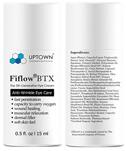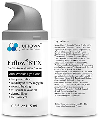 This is an all-in-one anti aging eye cream. Few Applications of our eye Cream formula makes the skin look younger. The complex is a power house packed with botanicals and anti wrinkle ingredients that have multiple preventative functions which includes firming, building essential collagen and increasing moisture nourishment. Fi-Flow makes the product feel like a soft mousse that is transformed into a light serum like a feather once applied to skin. Fiflow® BTX has an instantaneous dermal filling and muscular relaxation effect. The best eye wrinkle cream also has long-term effects due to its capacity to supply Oxygen to the skin. Eye cream promotes healing and focuses on reducing wrinkles specifically around the eye. It is designed for all skin types, and has particular anti aging properties that smooth wrinkles and leave skin looking plump and supple. Critical Ingredient of our future perfect eye cream act in multiple levels (fast penetration, instant skin volume, muscular relaxation, wrinkle reduction, combat inflammation and restore moisture and smoothness to dry skin). Excellent product for men and women. It is time to stop hiding in the dark and turn on the illuminating light with the best Eye Wrinkle Cream. Uptown Cosmeceuticals Future Perfect formula eye cream will give you excellent results and make your eyes look and feel younger. Click the Button at the Top of this Page to Buy with Confidence