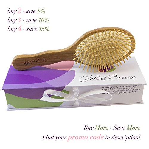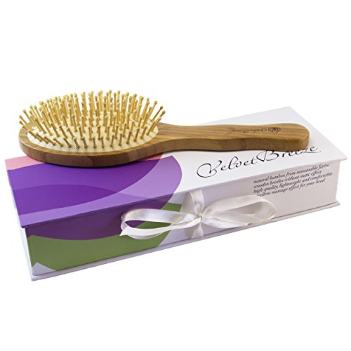We are glad to introduce you our VelvetBreeze bamboo hair brush that is steadily gaining popularity among both professional hairdressers and regular users.It can be excellent gift for a health and environment conscious person who has hair (thin, thick, curly). It will be perfect present for women, men and toddlers. Because bamboo bristles and wooden pins are gentle and rubber pad is soft, this brush is suitable also for people with sensitive scalp and dandruff