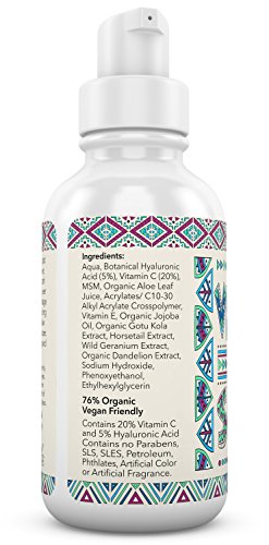 - • Concentrated, quality Ingredients – Formulated with only the highest quality natural & organic ingredients, and nothing more. Our serum contains botanical Hyaluronic Acid, MSM, Organic Aloe Vera, Vitamin E, Organic Jojoba Oil and organic extracts. Gentle enough to use around the eye area, neck and décolleté both day and night.