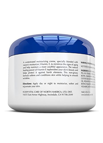 A concentrated moisturizing creme, specially blended with nature's moisturizer, Vitamin E, to minimize the signs of aging and help maintain a more youthful appearance. The natural healing power of Vitamin E replenishes your skin's beauty and helps protect it against harsh elements. This non-greasy formula softens and conditions skin while helping to smooth wrinkles.
