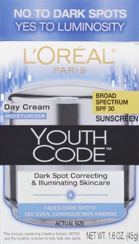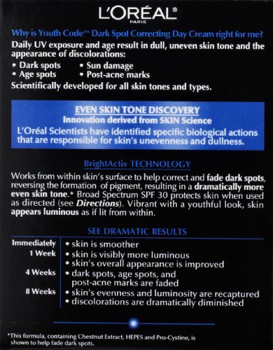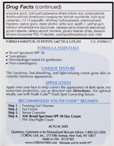 INDICATIONS: Loreal Youth Code dark spot day cream moisturizer with SPF30 Daily UV exposure and age result in dull, uneven skin tone and the appearance of discolorations such as dark spots, sun spots, age spots, post acne marks.